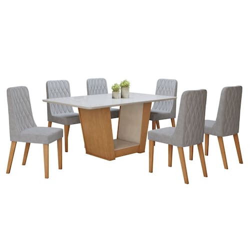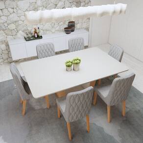 Sim, o tampo de MDF com vidro facilita a limpeza e manutenção do conjunto, ideal para o dia a dia. Medida da Mesa (A x L x P): 77,9cmx160cmx80cm Peso da Mesa: 49,49 kg Mesa suporta até: 50 kg Acabamento da Cadeira/Banco: Pintura Acabamento da Mesa: Pintura UV Acompanha Manual de Instalação: Sim Almofada do assento: Fixa Ambiente Principal: Sala de Jantar Cadeira/Banco estofada: Encosto e Assento Estofados Cadeira/Banco suporta até: 120 kg codigo_ean: 7900288135810 Complexidade da Montagem: Alta: deve ser montado por um montador especializado Cor: Amêndoa Clean/Off White/Cinza Cor do Produto: Amêndoa Clean/Off White/Cinza Cor Secundária: Cinza De Canto (Canto Alemão): Não Enchimento do Assento: Espuma D-20 Enchimento do Encosto: Espuma D-18 Escala de Brilho: Fosco Espessura do Tampo: 29 mm Espessura do Vidro: mm Estrutura do Assento: MDF Estrutura do Encosto: MDF Formato do Tampo: Retangular Itens Inclusos: 1 Conjunto Sala de Jantar, Manual de Montagem e Kit Ferragens Manual de Montagem e Instalação: https://cdn2.madeiramadeira.com.br/prd/mOveis-lopas/2762048-1742906235-982802-151341.pdf Marca: Móveis Lopas Material da Base da Mesa: MDF/MDP Material da Estrutura da Cadeira: MDF Material do Tampo: Vidro/MDF Medida da Cadeira/Banco (A x L x P): 97cmx43cmx57cm Medida do Tampo (L x C x E): 160cmx80cmx29mm Mesa Extensível: Não Necessita Montagem: Sim Origem do Produto: Nacional Peso da Cadeira/Banco: 9,3 kg Possui Apoio Para os Pés: Não Possui Vidro: Sim Quantidade de Cadeiras: 6 Quantidade de Lugares: 06 Recomendações de Uso, Manutenção e Limpeza: Limpar com flanela limpa e seca. Não usar produtos abrasivos. Revestimento da Cadeira/Banco: Linho Sistema de Montagem: Parafusos. Tipo de Encosto: Fixo