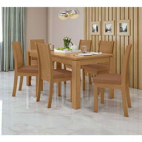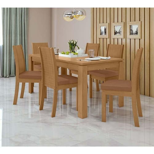 Conjunto Sala De Jantar 6 Cadeiras Athenas 180 Lopas Amêndoa Clean/corano Caramelo Medida da Mesa (A x L x P)80 cm x 90 cm x 180 cmMedida do Tampo (L x C)90 cm x 180 cmFormatoRetangularMaterial do TampoMDFQuantidade de Lugares6Pés da MesaMDP/MDPMedida da Cadeira (A x L x P)101 cm x 43 cm x 54 cmMaterial da CadeiraMDF / MDPPés da CadeiraMDFAlmofada do AssentoFixaCadeira EstofadaSimAssento EnchimentoEspuma D-20Revestimento da Cadeira Corano CarameloEncostoMDFPrazo de Garantia3 meses contra defeitos de fabricaçãoNecessita de MontagemSimDica de MontagemRecomendamos que a montagem seja feita por profissional de sua confiançaRecomendações de LimpezaUtilizar pano macio, seco ou ligeiramente umedecido com águaInformaçõesOs objetos que ambientam as fotos não acompanham o produto