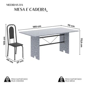 Quer deixar sua casa completa e prática? Uma dica bacana de como transformar o seu lar, deixando-o mais receptivo e bonito? Então você precisa de móveis indispensáveis para deixar seu lar muito mais aconchegante, receptivo e sempre disponível para receber a visita de amigos, familiares e convidados. Você vai se apaixonar por este incrível e moderno Conjunto de Mesa com 8 Cadeiras. Ideal para cozinha, ele é a melhor opção para completar o espaço que você desejar. Aproveite!! Medida da Mesa (A x L x P): 75,8 cm x 180 cm x 75 cm Peso da Mesa: 104,24 kg Mesa suporta até: 10.0000 Acabamento da Cadeira/Banco: Pintura Texturizada Acabamento da Mesa: Pintura Texturizada Ambiente Principal: Cozinha Cadeira/Banco Estofada: Encosto e Assento Estofados Cadeira/Banco estofada: Encosto e Assento Estofados Cadeira/Banco suporta até: 120.0000 codigo_ean: 7900288152848 Complexidade da Montagem: Baixa: pode ser montado por uma pessoa sozinha Cor: Preto / Prata Cor do Produto: Preto / Prata Cor Secundária: Cinza De Canto (Canto Alemão): Não Enchimento do Assento: Espuma D-16 Escala de Brilho: Brilhante Espessura do Tampo: 1,5 mm Estrutura do Assento: MDP Formato do Tampo: Retangular Itens Inclusos: 1 Mesa, 8 Cadeiras, Manual de Montagem e Kit Ferragens Linha ou Coleção: Lara Manual de Montagem e Instalação: https://product-hub-prd.madeiramadeira.com.br/303010228/documents/06dc3db5-7575-44c8-9d37-39ecd27527d280282374535281744236778593.pdf Marca: Soma Móveis Material da Base da Mesa: Aço Material da Estrutura da Cadeira: Aço Material do Tampo: Granito Material Principal: Madeira Medida da Cadeira/Banco (A x L x P): 105 cm x 37 cm x 40 cm Medida do Tampo (L x C x E): 180cm x 75cm x 1,5 cm Mesa Extensível: Não Necessita Montagem: Sim Origem do Produto: Nacional Peso da Cadeira/Banco: 2,7 kg Possui Apoio Para os Pés: Não Possui Suporte Giratório: Não Quantidade de Cadeiras: 8 Quantidade de Lugares: 08 Recomendações de Uso, Manutenção e Limpeza: Não permitir que molhe os pés da base, usar um pano de tecido macio e seco, evitar detergentes, alvejantes e produtos químicos de limpeza; no tampo usar tecido macio levemente umedecido. Revestimento da Cadeira/Banco: Couro Ecológico Sistema de Montagem: Parafusos Marca: Não Informado
