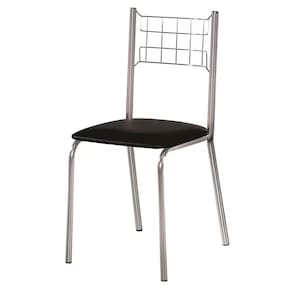 As Cadeiras Íris completam o conjunto com estrutura em aço cromado e assento estofado em Corino com espuma D-23, suportando até 100 Kg. As sapatas antirrisco e antirruído protegem o piso, enquanto o design ergonômico proporciona conforto nas refeições.