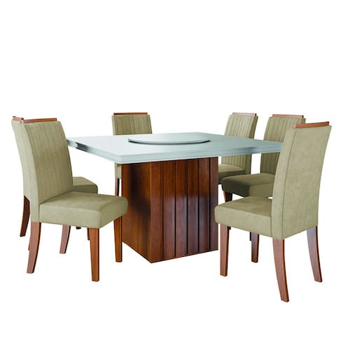 O conjunto de Mesa Amsterdã New com 6 cadeiras Grécia é uma combinação perfeita de charme e sofisticação para qualquer ambiente. A mesa apresenta um tampo giratório para ajudar nas refeições em MDF de alta resistência, com base ripada que adiciona um toque de elegância proporcionando flexibilidade e funcionalidade. A Cadeira Grécia é uma peça de destaque que traz estilo e conforto para o seu espaço. Com assento acolchoado e encosto bordado com espaldar, ela é revestida com tecido Veluplus de alta qualidade, que oferece toque macio e durabilidade excepcional. Feita com materiais resistentes e fáceis de limpar, a cadeira recebe um acabamento com quatro camadas de proteção, garantindo maior durabilidade e resistência.