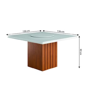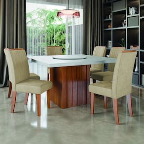 MEDIDAS: Medidas Mesa: [ A ] = 80 cm [ L ] = 136 cm [ P ] = 136 cm Medidas Cadeiras (Cada): [ A ] = 100 cm [ L ] = 42 cm [ P ] = 60 cm PESO MESA: 49 Kg PESO CADEIRA: 7,75 Kg (Cada) PESO SUPORTADO MESA: 30 Kg (Distribuídos) PESO SUPORTADO CADEIRA: 110 Kg cada MODELO: Conjunto de Mesa Amsterdã New Tampo Giratório para Sala de Jantar 1,36m com 6 Cadeiras Grécia MARCA: Dobuê COR DA MESA: Estrutura: Madeirado / Tampo: Off White COR DA CADEIRA: Estrutura: Madeirado / Assento: Bege ESTRUTURA: MDF ACABAMENTO MESA: Pintura UV ACABAMENTO CADEIRA: Veluplus TECIDO DA CADEIRA: Veluplus REVESTIMENTO ASSENTO E ENCOSTO DA CADEIRA: Espuma D20 MATERIAL DO TAMPO: MDF TAMPO GIRATÓRIO: Sim ESPALDAR: Sim PÉS DA CADEIRA: Sapatas Plásticas DIFERENCIAL: Material em MDF de alta resistência, tampo giratório, cadeiras com assento e encosto acolchoados, tecido veluplus e espaldar. SISTEMA DE MONTAGEM: Parafusos e porcas cilíndricas ITENS INCLUSOS: 1 Mesa e 6 cadeiras, 1 manual de montagem e 1 kit parafusos INSTRUÇÕES E CUIDADOS: Limpar com pano levemente umedecido com água, não utilizar produtos abrasivos GARANTIA: 3 meses pelo fabricante