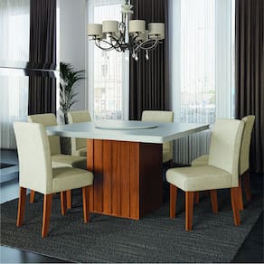 MEDIDAS: Medidas Mesa: [ A ] = 80 cm [ L ] = 136 cm [ P ] = 136 cm Medidas Cadeiras (Cada): [ A ] = 92 cm [ L ] = 42 cm [ P ] = 60 cm PESO MESA: 49 Kg PESO CADEIRA: 7,30 Kg (Cada) PESO SUPORTADO MESA: 30 Kg (Distribuídos) PESO SUPORTADO CADEIRA: 110 Kg cada MODELO: Conjunto Sala de Jantar Amsterdã New Mesa com Tampo Giratório 6 Cadeiras Trieste MARCA: Dobuê COR DA MESA: Estrutura: Madeirado / Tampo: Off White COR DA CADEIRA: Estrutura: Madeirado / Assento: Bege ESTRUTURA: MDF ACABAMENTO MESA: Pintura UV ACABAMENTO CADEIRA: Veluplus TECIDO DA CADEIRA: Veluplus REVESTIMENTO ASSENTO E ENCOSTO DA CADEIRA: Espuma D20 MATERIAL DO TAMPO: MDF TAMPO GIRATÓRIO: Sim PÉS DA CADEIRA: Sapatas Plásticas DIFERENCIAL: Material em MDF de alta resistência, tampo giratório, cadeiras com assento e encosto acolchoados, tecido Veluplus. SISTEMA DE MONTAGEM: Parafusos e porcas cilíndricas ITENS INCLUSOS: 1 Mesa e 6 cadeiras, 1 manual de montagem e 1 kit parafusos INSTRUÇÕES E CUIDADOS: Limpar com pano levemente umedecido com água, não utilizar produtos abrasivos GARANTIA: 3 meses pelo fabricante