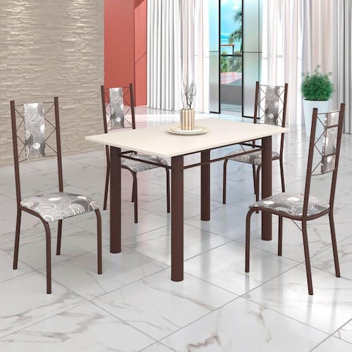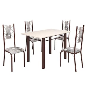 O Conjunto Sala de Jantar Bahia é uma ótima escolha para quem busca combinar estilo e praticidade. Este conjunto apresenta uma mesa retangular com um design elegante e moderno, acompanhada por quatro cadeiras. A mesa tem uma estrutura tubular de 3", que oferece estabilidade ao conjunto. O tampo em madeira MDP com acabamento em laca off white oferece um visual elegante e clean. A laca off white confere um toque de luminosidade e sofisticação à superfície, enquanto o MDP a torna adequada para o uso diário. Essa combinação cria um visual contemporâneo e versátil sendo opção prática e estilosa para diversos ambientes. As quatro cadeiras incluídas no conjunto apresentam um design que combina harmoniosamente com a mesa. Seu conforto é garantido pelo estofamento e pelo assento anatômico. Acabamento da Cadeira/Banco: Pintura Texturizada Acabamento da Mesa: Pintura Texturizada Acompanha Manual de Instalação: Sim Almofada do assento: Fixa Ambiente Principal: Sala de Jantar Cadeira/Banco estofada: Sim Cadeira/Banco suporta até: 120 Complexidade da Montagem: Média: pode ser montado por mais de uma pessoa e/ou necessite de maior conhecimento para montagem Cor: Paraopeba/Marrom Cor do Produto: Paraopeba/Marrom Cor do Tampo: Branco Enchimento do Assento: Espuma D-12 Enchimento do Encosto: Espuma D-12 Escala de Brilho: Semi-Fosco Espessura do Tampo: 15 Estrutura do Assento: Assento em MDP de 15mm c/ courino. Estrutura do Encosto: MDP de 15mm, espuma 1,2mm, courino, ferro 4,5. Formato do Tampo: Retangular Itens Inclusos: 1 Mesa, 4 Cadeiras, Kit Ferragens e Manual de Montagem Linha ou Coleção: Bahia Manual de Montagem e Instalação: https://cdn2.madeiramadeira.com.br/atributo/moveis-teixeira/1498834-cadeira-bahia-e-tampo-mdp.pdf Material da Base da Mesa: Aço Material da Estrutura da Cadeira: Aço Material Principal das Cadeiras/Bancos: Aço Medida da Base (A x L x P): 75,5cm x 65cm x 85,5cm Medida da Cadeira/Banco (A x L x P): 100cm x 36cm x 52cm Medida da Mesa (A x L x P): 75cm x 120cm x 75cm Medida do Tampo (L x C x E): 120cm x 75cm x 1,5cm Mesa suporta até: 8 Necessita Montagem: Sim Origem do Produto: Nacional Peso da Cadeira/Banco: 3.04 Peso da Mesa: 16.15 Possui Apoio para Braços: Não Possui Apoio Para os Pés: Não Possui Rodízio: Não Possui Suporte Giratório: Não Recomendações de Uso, Manutenção e Limpeza: Pano levemente umedecido e pano seco. Não utilizar produtos de limpeza Revestimento da Cadeira/Banco: Courino Sistema de Montagem: Parafusos Ean: 7909903411247