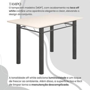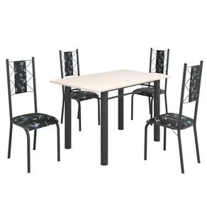 O Conjunto Sala de Jantar Bahia é uma ótima escolha para quem busca combinar estilo e praticidade. Este conjunto apresenta uma mesa retangular com um design elegante e moderno, acompanhada por quatro cadeiras. A mesa tem uma estrutura tubular de 3", que oferece estabilidade ao conjunto. O tampo em madeira MDP com acabamento em laca off white oferece um visual elegante e clean. A laca off white confere um toque de luminosidade e sofisticação à superfície, enquanto o MDP a torna adequada para o uso diário. Essa combinação cria um visual contemporâneo e versátil sendo opção prática e estilosa para diversos ambientes. As quatro cadeiras incluídas no conjunto apresentam um design que combina harmoniosamente com a mesa. Seu conforto é garantido pelo estofamento e pelo assento anatômico. Acabamento da Cadeira/Banco: Pintura Texturizada Acabamento da Mesa: Pintura Texturizada Acompanha Manual de Instalação: Sim Almofada do assento: Fixa Ambiente Principal: Sala de Jantar Cadeira/Banco estofada: Sim Cadeira/Banco suporta até: 120 Complexidade da Montagem: Média: pode ser montado por mais de uma pessoa e/ou necessite de maior conhecimento para montagem Cor: Preto Floral/Prata Cor do Produto: Preto Floral/Prata Cor do Tampo: Branco Enchimento do Assento: Espuma D-12 Enchimento do Encosto: Espuma D-12 Escala de Brilho: Semi-Fosco Espessura do Tampo: 15 Estrutura do Assento: Assento em MDP de 15mm c/ courino. Estrutura do Encosto: MDP de 15mm, espuma 1,2mm, courino, ferro 4,5. Formato do Tampo: Retangular Itens Inclusos: 1 Mesa, 4 Cadeiras, Kit Ferragens e Manual de Montagem Linha ou Coleção: Bahia Manual de Montagem e Instalação: https://cdn2.madeiramadeira.com.br/atributo/moveis-teixeira/1498834-cadeira-bahia-e-tampo-mdp.pdf Material da Base da Mesa: Aço Material da Estrutura da Cadeira: Aço Material Principal das Cadeiras/Bancos: Aço Medida da Base (A x L x P): 75,5cm x 65cm x 85,5cm Medida da Cadeira/Banco (A x L x P): 100cm x 36cm x 52cm Medida da Mesa (A x L x P): 75cm x 120cm x 75cm Medida do Tampo (L x C x E): 120cm x 75cm x 1,5cm Mesa suporta até: 8 Necessita Montagem: Sim Origem do Produto: Nacional Peso da Cadeira/Banco: 3.04 Peso da Mesa: 16.15 Possui Apoio para Braços: Não Possui Apoio Para os Pés: Não Possui Rodízio: Não Possui Suporte Giratório: Não Recomendações de Uso, Manutenção e Limpeza: Pano levemente umedecido e pano seco. Não utilizar produtos de limpeza Revestimento da Cadeira/Banco: Courino Sistema de Montagem: Parafusos Ean: 7909903411308