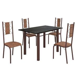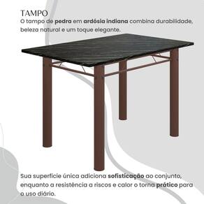 O Conjunto Sala de Jantar Bahia é uma ótima escolha para quem busca combinar estilo e praticidade. Este conjunto apresenta uma mesa retangular com um design elegante e moderno, acompanhada por quatro cadeiras. A mesa tem uma estrutura tubular de 3", que oferece estabilidade ao conjunto. O tampo em ardósia indiana oferece uma estética rústica e elegante. A ardósia indiana é conhecida por sua durabilidade e beleza marroml. Sua superfície proporciona um visual autêntico e sofisticado, além de ser resistente a riscos e manchas, tornando-a uma escolha prática para uso diário. A ardósia indiana adiciona um toque de charme marroml e uma sensação acolhedora ao ambiente, tornando-se um destaque na decoração. Acabamento da Cadeira/Banco: Pintura UV Acabamento da Mesa: Pintura UV Almofada do assento: Fixa Ambiente Principal: Sala de Jantar Cadeira/Banco estofada: Sim Cadeira/Banco suporta até: 120 Complexidade da Montagem: Média: pode ser montado por mais de uma pessoa e/ou necessite de maior conhecimento para montagem Cor: Marrom Cor do Produto: Marrom Enchimento do Assento: Espuma D-12 Escala de Brilho: Semi-Fosco Espessura do Tampo: 18 Estrutura do Assento: MDP de 15mm, espuma 1,2mm, courino, ferro 4,5. Formato do Tampo: Retangular Itens Inclusos: 1 Mesa, 4 Cadeiras, Kit Ferragens e Manual de Montagem Linha ou Coleção: Bahia Manual de Montagem e Instalação: https://cdn2.madeiramadeira.com.br/atributo/moveis-teixeira/1495797-cadeira-bahia-tampo-pedra.pdf Material da Base da Mesa: Aço Material da Estrutura da Cadeira: Aço Medida da Base (A x L x P): 75,5cm x 65cm x 85,5cm Medida da Cadeira/Banco (A x L x P): 100cm x 36cm x 52cm Medida da Mesa (A x L x P): 75cm x 120cm x 75cm Medida do Tampo (L x C x E): 120cm x 75cm x 1,8cm Mesa suporta até: 8 Necessita Montagem: Sim Origem do Produto: Nacional Peso da Cadeira/Banco: 3.04 Peso da Mesa: 49.76 Possui Apoio para Braços: Não Possui Apoio Para os Pés: Não Possui Rodízio: Não Possui Suporte Giratório: Não Quantidade de Cadeiras: 4 Recomendações de Uso, Manutenção e Limpeza: Pano levemente umedecido e pano seco. Não utilizar produtos de limpeza Revestimento da Cadeira/Banco: Courino Sistema de Montagem: Parafusos Tipo de Assento: Fixo Tipo de Encosto: Fixo Ean: 7909903410714