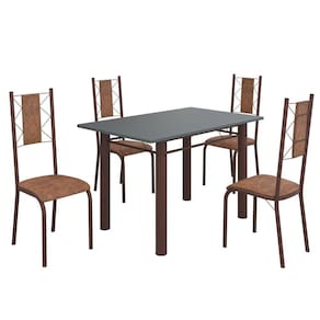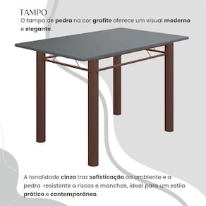 O Conjunto Sala de Jantar Bahia é uma ótima escolha para quem busca combinar estilo e praticidade. Ele apresenta uma mesa retangular com um design elegante e moderno, acompanhada por quatro cadeiras. A mesa tem uma estrutura tubular de 3", que oferece estabilidade ao conjunto. O tampo em pedra grafite oferece um visual moderno e sofisticado. A tonalidade do grafite confere elegância e versatilidade ao ambiente, enquanto a pedra proporciona durabilidade e resistência a riscos e manchas. Essa combinação de estética e funcionalidade cria um aspecto contemporâneo e prático, tornando o tampo em pedra grafite uma escolha marcante para adicionar estilo e resistência à sua sala de jantar. As quatro cadeiras incluídas no conjunto apresentam um design que combina harmoniosamente com a mesa. Acabamento da Cadeira/Banco: Pintura Texturizada Acabamento da Mesa: Pintura UV Acompanha Manual de Instalação: Sim Almofada do assento: Fixa Almofada do encosto: Fixa Ambiente Principal: Sala de Jantar Cadeira/Banco estofada: Sim Cadeira/Banco suporta até: 120 Complexidade da Montagem: Média: pode ser montado por mais de uma pessoa e/ou necessite de maior conhecimento para montagem Cor: Marrom Cor do Produto: Marrom Cor do Tampo: Cinza De Canto (Canto Alemão): Não Enchimento do Assento: Espuma D-12 Enchimento do Encosto: Espuma D-12 Escala de Brilho: Semi-Fosco Espessura do Tampo: 18 Estrutura do Assento: Aço Estrutura do Encosto: MDP de 15mm, espuma 1,2mm, courino, ferro 4,5. Formato do Tampo: Retangular Itens Inclusos: 1 Mesa, 4 Cadeiras, Kit Ferragens e Manual de Montagem Linha ou Coleção: Bahia Manual de Montagem e Instalação: https://cdn2.madeiramadeira.com.br/atributo/moveis-teixeira/1495440-cadeira-bahia-tampo-pedra.pdf Material da Base da Mesa: Aço Material da Estrutura da Cadeira: Aço Material Principal das Cadeiras/Bancos: Aço Medida da Base (A x L x P): 75,5cm x 65cm x 85,5cm Medida da Cadeira/Banco (A x L x P): 100cm x 36cm x 52cm Medida da Mesa (A x L x P): 75cm x 120cm x 75cm Medida do Tampo (L x C x E): 120cm x 75cm x 1,8cm Mesa Dobrável: Não Mesa Extensível: Não Mesa suporta até: 8 Necessita Montagem: Sim Origem do Produto: Nacional Peso da Cadeira/Banco: 3.04 Peso da Mesa: 49.76 Possui Apoio para Braços: Não Possui Apoio Para os Pés: Não Possui Prateleiras: Não Possui Rodízio: Não Possui Suporte Giratório: Não Possui Vidro: Não Quantidade de Cadeiras: 4 Recomendações de Uso, Manutenção e Limpeza: Usar um pano de tecido macio e seco, evitar detergentes, alvejantes e produtos químicos de limpeza; no tampo usar tecido macio levemente umedecido. Revestimento da Cadeira/Banco: Courino Sistema de Montagem: Parafusos Tipo de Assento: Fixo Tipo de Encosto: Estofado Ean: 7909903410554