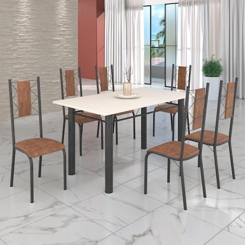 Conjunto Sala de Jantar Bahia Mesa Tubo 140x75cm Tampo Madeira com 6 Cadeiras Courino Marrom/mart. Prata