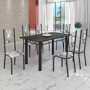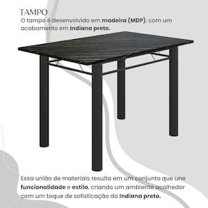 O Conjunto Sala de Jantar Bahia é uma ótima escolha para quem busca combinar estilo e praticidade. Este conjunto apresenta uma mesa retangular com um design elegante e moderno, acompanhada por seis cadeiras. A mesa tem uma estrutura tubular de 3", que oferece estabilidade ao conjunto. O tampo Indiana Preto, feito em madeira MDP, é uma combinação marcante de estética e praticidade. A cor Indiana Preto adiciona um toque de sofisticação e profundidade ao ambiente. O uso de madeira MDP oferece durabilidade e versatilidade, sendo perfeito para o uso cotidiano. As seis cadeiras incluídas no conjunto apresentam um design que combina harmoniosamente com a mesa. Seu conforto é garantido pelo estofamento e pelo assento anatômico. O conjunto Bahia se adapta bem a diferentes espaços. Acabamento da Cadeira/Banco: Pintura Texturizada Acabamento da Mesa: Pintura Texturizada Acompanha Manual de Instalação: Sim Almofada do assento: Fixa Ambiente Principal: Sala de Jantar Cadeira/Banco estofada: Sim Cadeira/Banco suporta até: 120 Complexidade da Montagem: Média: pode ser montado por mais de uma pessoa e/ou necessite de maior conhecimento para montagem Cor: Paraopeba/ Preto Fosco Cor do Produto: Paraopeba/ Preto Fosco Enchimento do Assento: Espuma D-12 Escala de Brilho: Semi-Fosco Espessura do Tampo: 15 Estrutura do Assento: Assento em MDP de 15mm c/ courino. Formato do Tampo: Retangular Itens Inclusos: 1 Mesa, 6 Cadeiras, Kit Ferragens e Manual de Montagem Linha ou Coleção: Bahia Manual de Montagem e Instalação: https://cdn2.madeiramadeira.com.br/atributo/moveis-teixeira/1515543-base-3-1-40-mdp.pdf Material da Base da Mesa: Aço Material da Estrutura da Cadeira: Aço Material Principal das Cadeiras/Bancos: Aço Medida da Base (A x L x P): 75,5cm x 65cm x 112cm Medida da Cadeira/Banco (A x L x P): 100cm x 36cm x 52cm Medida da Mesa (A x L x P): 75cm x 140cm x 75cm Medida do Tampo (L x C x E): 140cm x 75cm x 1,5cm Mesa suporta até: 8 Necessita Montagem: Sim Origem do Produto: Nacional Peso da Cadeira/Banco: 3.04 Peso da Mesa: 20.82 Possui Apoio para Braços: Não Possui Apoio Para os Pés: Não Possui Rodízio: Não Possui Suporte Giratório: Não Quantidade de Cadeiras: 6 Recomendações de Uso, Manutenção e Limpeza: Usar um pano de tecido macio e seco, evitar detergentes, alvejantes e produtos químicos de limpeza; no tampo usar tecido macio levemente umedecido. Revestimento da Cadeira/Banco: Courino Sistema de Montagem: Parafusos Tipo de Assento: Fixo Tipo de Encosto: Estofado Ean: 7909903415474