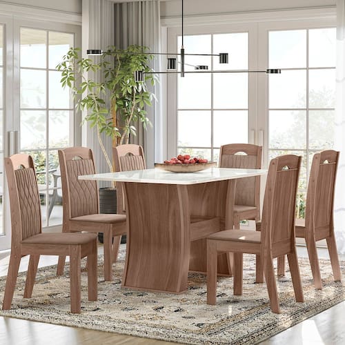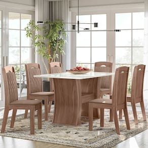 O conjunto Bélgica destaca-se pela impressão dos detalhes amadeirados, replicando um design clean e despojado. O tampo em vidro da um toque de modernidade ao ambiente, deixando o espaço das refeições ainda mais charmoso. Os acabamentos oferecem maior qualidade e durabilidade ao móvel. A imagem é ilustrativa. Itens inclusos:1 mesa;6 cadeiras estofadas. Obs: O produto segue com manual de instruções e com todas as ferragens necessárias para sua montagem. Não disponibilizamos serviço de montagem. INFORMAÇÕES: Pintura UV texturizada em alto relevo com alta resistência a riscos;Estofados com espuma de alta densidade;Cadeira com encosto ergonômico e,Design moderno e diferenciado.
