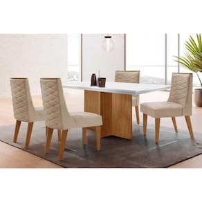 Sala de Jantar Completa Berlim c/ Tampo Madeirado c/ Vidro Canto Curvo 90x90cm e 4 Cadeiras Dafne Madeira Maciça Naturale/Off White - Capuccino/Suede Creme - Rufato