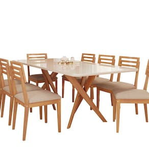 A Mesa Cacau é a escolha ideal para quem deseja transformar a sala de jantar em um espaço de acolhimento, estilo e sofisticação. Com opções de tampo retangular ou redondo, em MDF/Vidro temperado ou em MDF, a mesa se destaca pela leveza visual e toque contemporâneo. Sua base em madeira com design cruzado garante firmeza, personalidade e um charme arquitetônico ao ambiente. A Cadeira Juparanã traduz a essência do design funcional aliado à beleza da madeira natural. Com estrutura robusta em madeira de eucalipto e encosto ripado totalmente em madeira, oferece um visual limpo, leve e atemporal. O assento conta com espuma de alta densidade, garantindo conforto superior para o uso diário em salas de jantar e ambientes coletivos. Medida da Mesa (A x L x P): 77x210x100 Peso da Mesa: 80,88 kg Mesa suporta até: 40 kg Acabamento da Cadeira/Banco: Verniz Natural Acabamento da Mesa: Verniz Almofada do assento: Fixa Ambiente Principal: Sala de Jantar Cadeira/Banco Estofada: Somente Assento Estofado Cadeira/Banco estofada: Somente Assento Estofado Cadeira/Banco Suporta Até: 100.0000 Cadeira/Banco suporta até: 100 kg codigo_ean: 7908460019347 Complexidade da Montagem: Baixa: pode ser montado por uma pessoa sozinha Cor: Off White/ Bege Cor do Produto: Off White/ Bege Cor do Tampo: Bege Cor Flex: Não Cor Secundária: Marrom De Canto (Canto Alemão): Não Escala de Brilho: Semi-Brilho Espessura do Tampo: 29 mm Formato do Tampo: Retangular Itens Inclusos: 1 Mesa, 8 Cadeiras, Kit Ferragem e Manual de Montagem Linha ou Coleção: Juparanã/Cacau Manual de Montagem e Instalação: https://product-hub-prd.madeiramadeira.com.br/434135552/documents/1a09111b-7f7b-4544-bce0-4cca7b0b31753146356503517556122706338.pdf Marca: Cimol Material da Base da Mesa: Madeira Maciça Material da Estrutura da Cadeira: Madeira Maciça Material do Tampo: Vidro/MDF Medida da Cadeira/Banco (A x L x P): 88,3x43,7x52,8 Medida do Tampo (L x C x E): 100x210x2,9 Mesa Extensível: Não Montagem Flex: Não Necessita Montagem: Sim Origem do Produto: Nacional Peso da Cadeira/Banco: 10 kg Possui Apoio para Braços: Não Possui Apoio Para os Pés: Não Quantidade de Cadeiras: 8 Quantidade de Lugares: 08 Recomendações de Uso, Manutenção e Limpeza: Para manter seu móvel novo por muito mais tempo, evite locais úmidos, mantenha-o distante de líquidos. Para limpá-lo com segurança utilize uma flanela seca sem produtos abrasivos Sistema de Montagem: Parafusos, anel fixador e cantoneiras Tipo de Madeira Maciça da Base da Mesa: Eucalipto