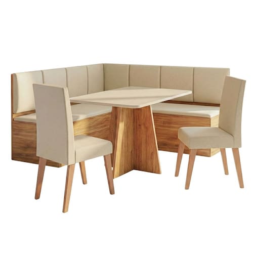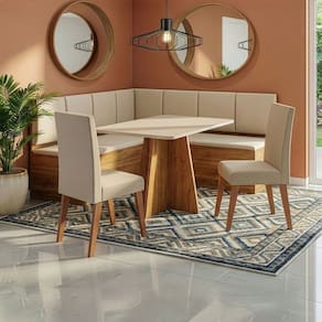 O Conjunto Sala de Jantar Canto Alemão Liebe com Mesa Move e 2 Cadeiras Milano é a escolha perfeita para transformar sua cozinha ou sala de jantar com charme, funcionalidade e conforto. O Canto Alemão Liebe com Baú oferece assentos confortáveis e espaço interno para armazenamento, ajudando na organização e no melhor aproveitamento do espaço. A Mesa Move apresenta um visual moderno e funcional, com estrutura firme e tampo elegante que harmoniza perfeitamente com o conjunto. As 2 Cadeiras Milano, produzidas em madeira maciça, garantem resistência, durabilidade e conforto, com assento estofado que torna as refeições ainda mais agradáveis. Um conjunto versátil e sofisticado, perfeito para quem busca funcionalidade, conforto e estilo na sala de jantar.