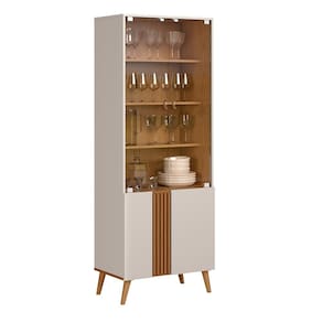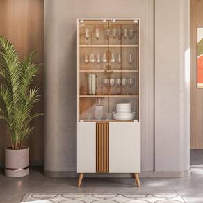 O detalhe ripado e os pés chanfrados reforçam a leveza do design, enquanto as portas e prateleiras internas garantem amplo espaço para organização e exposição de louças, taças e objetos decorativos.