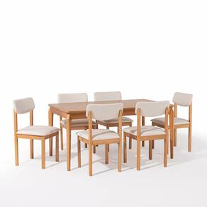 Desenvolvida para quem deseja mais acolhimento no décor, o conjunto Florença composto por 6 cadeiras com encosto e assento estofadas e 1 mesa de tampo laminado de 1,60 é perfeita. Por ser produzida com madeira maciça de eucalipto reflorestado e acabamento Verniz mel, juntamente com o tecido claro na cor cru 06 , proporciona um ambiente com estilo luminoso, arejado e acolhedor. É Ideal para sua cozinha e sala de jantar, formando um ambiente de bem estar perfeito para desfrutar junto de família e amigos uma refeição maravilhosa. Medida da Mesa (A x L x P): 76 x 160 x 90 Peso da Mesa: 30 kg Mesa suporta até: 50 kg Acabamento da Cadeira/Banco: Verniz Natural Acabamento da Mesa: Verniz Ambiente Principal: Sala de Jantar Cadeira/Banco Estofada: Encosto e Assento Estofados Cadeira/Banco estofada: Encosto e Assento Estofados Cadeira/Banco suporta até: 120 kg Cadeira/Banco Suporta Até: 120.0000 codigo_ean: 7900288285744 Complexidade da Montagem: Baixa: pode ser montado por uma pessoa sozinha Cor: Verniz Mel/Cru Cor do Produto: Verniz Mel/Cru Cor Secundária: Bege De Canto (Canto Alemão): Não Enchimento do Assento: Espuma D-23 Escala de Brilho: Semi-Brilho Espessura do Tampo: 35 mm Estrutura do Assento: MDF/Espuma Formato do Tampo: Retangular Informações Complementares: Este produto foi pensado e desenvolvido para elevar a decoração do seu ambiente interno e trazer um ar de sofisticação para sua sala de jantar. É recomendado seguir as instruções de manutenção e acabamento que acompanham a embalagem. Itens Inclusos: 1 Mesa, 6 Cadeiras, Manual de Montagem e Kit Ferragens Linha ou Coleção: Florença Manual de Especificação Técnica: https://product-hub-prd.madeiramadeira.com.br/941849164/documents/ae444e23-ef8f-4bea-b3d6-f85036fd9b8e3309704293217621799814252.pdf Manual de Montagem e Instalação: https://product-hub-prd.madeiramadeira.com.br/941849164/documents/4f72e73d-62ab-43cd-9238-2ce642bf0d553309705293217621801470834.pdf Marca: Casa e Jardim Móveis Material da Base da Mesa: MDF/Madeira Maciça Material da Estrutura da Cadeira: Madeira Maciça Material do Tampo: Laminado Medida da Cadeira/Banco (A x L x P): 88 x 48 x 51 Medida do Tampo (L x C x E): 160 x 90 x 3,5 Mesa Extensível: Não Necessita Montagem: Sim Origem do Produto: Nacional Peso da Cadeira/Banco: 6,5 kg Possui Apoio Para os Pés: Não Quantidade de Cadeiras: 6 Quantidade de Lugares: 06 Recomendações de Uso, Manutenção e Limpeza: Utilizar em ambiente interno ,coberto. Os tampos das mesas são de MDF com encabeçamento em madeira maciça, evite molhar ou deixar líquidos por muito tempo para que não ocorra bolhas.o expor ao sol e chuva. Cuidados e limpeza : Retire o pó com uma flanela macia, seca ou levemente umedecida. Passe uma esponja macia e levemente umedecida. Não utilizar álcool ou produtos químicos, abrasivos ou solventes. Revestimento da Cadeira/Banco: Poliéster Sistema de Montagem: parafusos , mas somente a mesa, as cadeiras já vão montadas