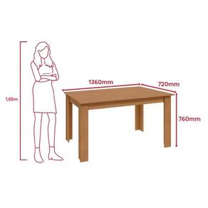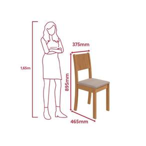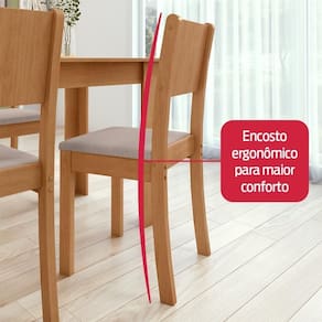 A mesa possui um tampo com acabamento em verniz de baixo relevo, realçando os veios da madeira de forma elegante e natural. Já as cadeiras são ergonômicas, com encosto projetado para garantir conforto durante as refeições.