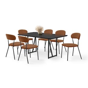 Conjunto sala de jantar, moderno, slim design inovador, estrutura em aço carbono com pintura electrostática a pó de alta qualidade, resistência e durabilidade, mesa com tampo de mdf laqueado com vidro colado. Cadeira estofada de encosto ergonómico, confortável, acabamentos finos e delicados. produto de fácil montagem. Medida da Mesa (A x L x P): 78x90x160 Peso da Mesa: 41,45 kg Mesa suporta até: 30 kg Acabamento da Cadeira/Banco: Pintura Epóxi Acabamento da Mesa: Pintura Epóxi Acompanha Manual de Instalação: Sim Almofada do assento: Fixa Altura do Conjunto: 85 cm Ambiente Principal: Sala de Jantar Cadeira/Banco Estofada: Encosto e Assento Estofados Cadeira/Banco estofada: Encosto e Assento Estofados Cadeira/Banco suporta até: 120 kg codigo_ean: 7900288180032 Complexidade da Montagem: Baixa: pode ser montado por uma pessoa sozinha Configuração do Conjunto: Mesa com Cadeiras Cor: Black/ Terracota Cor da Base: Bege Cor das Cadeiras: Bege Cor do Produto: Black/ Terracota Cor do Tampo: Off White Cor Secundária: Cinza De Canto (Canto Alemão): Não Design da Base: Padrão Enchimento do Assento: Espuma D-23 Enchimento do Encosto: Espuma D-16 Escala de Brilho: Semi-Fosco Espessura do Tampo: 28 mm Formato do Tampo: Retangular Informações Complementares: Mesa em Aço Carbono na cor Black - tampo Preto - Cadeiras em Aço Carbono na cor Black e revestimento Linho A-521 (Terracota) Itens Inclusos: 1 Mesa, 6 Cadeiras, Kit Ferragens e Manual de Montagem Largura do Conjunto: 190 cm Linha ou Coleção: Betina Manual de Montagem e Instalação: https://product-hub-prd.madeiramadeira.com.br/272848282/documents/b3aed56d-fe0e-4825-ac88-a8c8fdaad5d03015465598517507842428833.pdf Marca: Aço Nobre Móveis Material da Base da Mesa: Aço Carbono Material da Estrutura da Cadeira: Aço Carbono Material do Tampo: Vidro/MDF Material Principal: Aço Carbono Material Principal das Cadeiras/Bancos: Aço Carbono Medida da Base (A x L x P): 75x80x45 Medida da Cadeira/Banco (A x L x P): 85x48x56 Medida do Tampo (L x C x E): 90x160x28 Mesa Dobrável: Não Mesa Extensível: Não Montagem Flex: NÃO Necessita Montagem: Sim Origem do Produto: Nacional Peso da Cadeira/Banco: 5 kg Possui Apoio para Braços: Não Possui Apoio Para os Pés: Não Possui Prateleiras: Não Possui Suporte Giratório: Não Possui Vidro: Sim Profundidade do Conjunto: 280 cm Quantidade de Cadeiras: 6 Quantidade de Lugares: 06 Recomendações de Uso, Manutenção e Limpeza: Limpeza com pano macio e levemente umedecido. Não ultilizar solventes a base e de inflamáveis. Não utilizar produtos abrasivos. Revestimento da Cadeira/Banco: Linho Sistema de Montagem: Parafusos e Chave Allen Tipo de Assento: Fixo Tipo de Encosto: Fixo