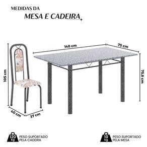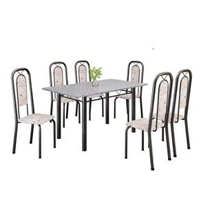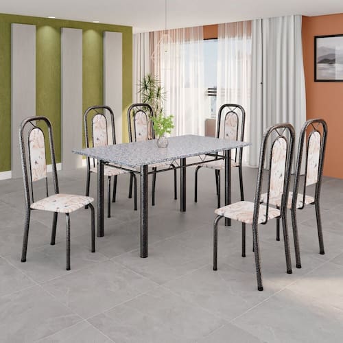Quer deixar sua casa completa e prática? Uma dica bacana de como transformar o seu lar, deixando-o mais receptivo e bonito? Então você precisa de móveis indispensáveis para deixar seu lar muito mais aconchegante, receptivo e sempre disponível para receber a visita de amigos, familiares e convidados. Você vai se apaixonar por este incrível e moderno Conjunto de Mesa com 6 Cadeiras. Ideal para cozinha, ele é a melhor opção para completar o espaço que você desejar. Aproveite!! Medida da Mesa (A x L x P): 75,8 cm x 140 cm x 75 cm Peso da Mesa: 59,4 kg Mesa suporta até: 10.0000 Acabamento da Cadeira/Banco: Pintura Texturizada Acabamento da Mesa: Pintura Texturizada Ambiente Principal: Cozinha Cadeira/Banco Estofada: Encosto e Assento Estofados Cadeira/Banco estofada: Encosto e Assento Estofados Cadeira/Banco suporta até: 120.0000 codigo_ean: 7900288149817 Complexidade da Montagem: Baixa: pode ser montado por uma pessoa sozinha Cor: Bege / Prata Cor do Produto: Bege / Prata Cor Secundária: Bege De Canto (Canto Alemão): Não Enchimento do Assento: Espuma D-16 Escala de Brilho: Brilhante Espessura do Tampo: 1,5 mm Estrutura do Assento: MDP Formato do Tampo: Retangular Itens Inclusos: 1 Mesa, 6 Cadeiras, Manual de Montagem e Kit Ferragens Linha ou Coleção: Lara Manual de Montagem e Instalação: https://product-hub-prd.madeiramadeira.com.br/434622584/documents/87fb18d3-7f67-47c5-a23b-51fdab8edc7c02821966352817442234269539.pdf Marca: Soma Móveis Material da Base da Mesa: Aço Material da Estrutura da Cadeira: Aço Material do Tampo: Granito Medida da Cadeira/Banco (A x L x P): 105 cm x 37 cm x 40 cm Medida do Tampo (L x C x E): 140cm x 75cm x 1,5 cm Mesa Extensível: Não Necessita Montagem: Sim Origem do Produto: Nacional Peso da Cadeira/Banco: 2,7 kg Possui Apoio Para os Pés: Não Quantidade de Cadeiras: 6 Quantidade de Lugares: 06 Recomendações de Uso, Manutenção e Limpeza: Não permitir que molhe os pés da base, usar um pano de tecido macio e seco, evitar detergentes, alvejantes e produtos químicos de limpeza; no tampo usar tecido macio levemente umedecido. Revestimento da Cadeira/Banco: Couro Ecológico Sistema de Montagem: Parafusos
