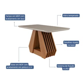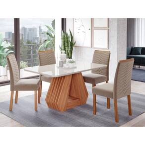 Sala de jantar Agata de 1,30x,0,80 com 4 cadeiras Clarice. Que tal reunir a sua família para um jantar? Nesse momento a Cimol vai está presente, proporcionando situações agradáveis e descontraídas! A mesa Agata possui uma base em formato triangular, seu tampo é em mdf/vidro com bordas chanfradas e acabamento em laca. A cadeira Clarice representa a fusão perfeita entre elegância, conforto e praticidade. Sua estrutura é habilmente confeccionada em madeira, conferindo-lhe não apenas uma base sólida e durável, mas também um toque de rusticidade refinada que complementa diversos estilos de decoração. O assento e o encosto da cadeira são revestidos com estofamento de alta qualidade, proporcionando uma experiência de conforto excepcional.