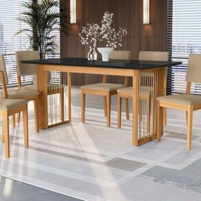 Medindo 76,5cm de altura, 134,5cm de largura e 59cm de profundidade, ela é perfeita para todos os ambientes, e quando combinada ao tampo, acomoda até seis pessoas. Em MDF de 30mm, o tampo é na cor preto fosco, com destaque para o vidro na mesma cor, garantindo um acabamento único e moderno à composição, além de elegância ao espaço. Medindo 160cm x 90cm, suporta até 90kg e conta com bordas arredondadas.