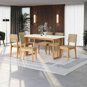 Para quem busca por modernidade e estilo, o Conjunto CSJ331CA da Linha Sala de Jantar Premium Kappesberg vai conquistar o seu espaço. Com design moderno, a base é robusta e resistente, produzida em madeira de eucalipto, garante maior durabilidade, além de uma beleza única. Com formato retangular, o destaque fica para o detalhe das cordas nas laterais, proporcionando um acabamento leve e moderno. Medindo 76,5cm de altura, 134,5cm de largura e 59cm de profundidade, ela é perfeita para todos os ambientes, e quando combinada ao tampo, acomoda até seis pessoas. Em MDF de 30mm, o tampo é na cor off white, com destaque para o vidro na mesma cor, garantindo um acabamento único e moderno à composição, além de elegância ao espaço. Medindo 160cm x 90cm, suporta até 90kg e conta com bordas arredondadas. Já as cadeiras que compõem o conjunto, no modelo Dora, também em madeira de eucalipto, contam com assento e encosto desmontados, suportando até 120kg e combina com todos os momentos. Medindo 89cm de altura, sendo 47,5cm a altura do assento, 44cm de largura e 53cm de profundidade, para mais comodidade, ela possui assento e encosto estofados e recobertos com tecido boucle bege, garantindo um toque suave e gostoso, proporcionando conforto em todos os momentos. O destaque fica para a estrutura atrás do encosto, que além de um acabamento lindo, facilita o manuseio, garantindo um acabamento único e deixando sua sala de jantar espaço ainda mais completa. Renove e transforme seu espaço com o Conjunto de Mesa da Sala de Jantar Premium Kappesberg. Medidas: - 83 cm de altura - 160 cm de largura - 90 cm de profundidade Itens inclusos: - Uma (1) mesa em Madeira Maciça - Seis (6) Cadeiras em Madeira Maciça - Estrutura em MDF Código do produto: CSJ331CA-A058 Informações importantes: - As imagens são ilustrativas. - A Kappesberg não disponibiliza serviço de montagem (recomendamos a contratação de um profissional qualificado). - O manual de montagem acompanha o produto. - 3 meses de garantia para defeitos de fabricação. Cor: Boucle Bege | Garantia: 3 meses para defeito de fabricação | Matéria-prima: MDF | Peso máximo suportado: 90 Kg | Quantidade de cadeiras: 6 | Montagem: Necessita montagem | Quantidade de caixas de embalagem: 3 | Inclui manual de montagem: Sim | Duração da garantia: 3 meses | Requer montagem: Sim | Tipo de garantia: Garantia do fabricante