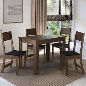 A mesa possui estrutura resistente em MDP de 15mm, acabamento na sofisticada cor Noce/Off-white, e conta com tampo retangular que acomoda confortavelmente até quatro pessoas. Já as cadeiras combinam estrutura firme com assentos estofados e revestimento em tecido preto, oferecendo conforto e resistência para o uso diário.