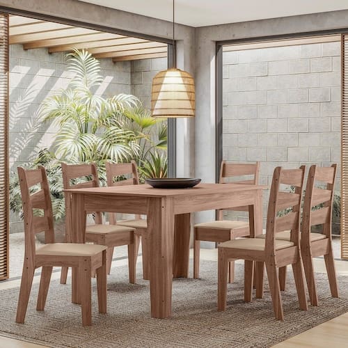 O conjunto Italia destaca-se pela impressão dos detalhes amadeirados, replicando um design clean e despojado, dando um toque de modernidade ao ambiente e deixando o espaço das refeições ainda mais charmoso. Os acabamentos oferecem maior qualidade e durabilidade ao móvel. A imagem é ilustrativa. Itens inclusos:1 mesa (MDF);6 cadeiras (MDF/MDP) com assentos estofados. Obs: O produto segue com manual de instruções e com todas as ferragens necessárias para sua montagem. Não disponibilizamos serviço de montagem. INFORMAÇÕES: Pintura UV texturizada em alto relevo com alta resistência a riscos;Estofados com espuma de alta densidade;Cadeira com encosto ergonômico e,Design moderno e diferenciado. DIMENSÕES DA MESA Altura: 785 mmLargura: 900 mmProfundidade: 1350 mmMaterial: MDF 15mm com Tampo em MDP 25mm. DIMENSÕES DAS CADEIRAS Altura: 960 mmLargura: 380 mmProfundidade: 440 mmMDF 15mm e 18mmAssento estofado com espuma D12 e revestido em tecido