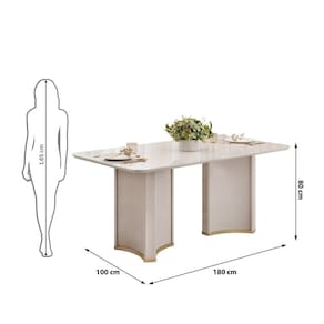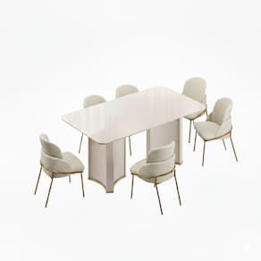 refeições memoráveis e encontros especiais. Medida da Mesa (A x L x P): 80X180X100 Peso da Mesa: 77,7 kg Mesa suporta até: 15 kg Acabamento da Cadeira/Banco: Cromado Acabamento da Mesa: Pintura Texturizada Almofada do assento: Fixa Ambiente Principal: Sala de Jantar Cadeira/Banco Estofada: Encosto e Assento Estofados Cadeira/Banco estofada: Encosto e Assento Estofados Cadeira/Banco Suporta Até: 130.0000 Cadeira/Banco suporta até: 130 kg codigo_ean: 7900288270146 Complexidade da Montagem: Média: pode ser montado por mais de uma pessoa e/ou necessite de maior conhecimento para montagem Cor: Off White/Perola Cor do Produto: Off White/Perola Cor Secundária: Bege De Canto (Canto Alemão): Não Enchimento do Assento: Espuma D-20 Escala de Brilho: Acetinado Espessura do Tampo: 25 mm Estrutura do Assento: Espuma Formato do Tampo: Retangular Itens Inclusos: 1 Mesa, 6 Cadeiras e Kit Ferragens Linha ou Coleção: Vitta/Liz Manual de Especificação Técnica: https://product-hub-prd.madeiramadeira.com.br/133102129/documents/9c8d00d6-908d-4328-93f6-6894b8d14d163258161531617594906032542.pdf Manual de Montagem e Instalação: https://product-hub-prd.madeiramadeira.com.br/133102129/documents/c1e556bf-b002-4c6f-b248-72f06c3e205d3258160531617594905968174.pdf Marca: Dj Móveis Material da Base da Mesa: MDF/MDP Material da Estrutura da Cadeira: Aço Carbono Material do Tampo: MDF Material Principal: Madeira Medida da Cadeira/Banco (A x L x P): 87X58X60 Medida do Tampo (L x C x E): 180X1000X2,5 Mesa Extensível: Não Necessita Montagem: Sim Origem do Produto: Nacional Peso da Cadeira/Banco: 7,85 kg Possui Apoio Para os Pés: Não Quantidade de Cadeiras: 6 Quantidade de Lugares: 06 Recomendações de Uso, Manutenção e Limpeza: Para manter seu móvel novo por muito mais tempo, evite locais úmidos, mantenha-o distante de líquidos e de fontes de calor. Evite a exposição prolongada ao sol. Para limpá-lo com segurança utilize uma flanela seca sem produtos abrasivos e nem lustra móveis. Revestimento da Cadeira/Banco: Boucle Sistema de Montagem: Cavilhas e parafusos