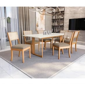 Assento: Espuma | Cor: Linho Fendi c/ tela bege | Diferenciais: Encosto de tela | Espuma: Densidade 33 | Matéria-prima: Eucalipto | Forma: Retangular | Requer montagem: Sim | Montagem: Necessita montagem | Quantidade de caixas da embalagem: 4 | Inclui manual de montagem: Sim | Altura: 83 | Quantidade de cadeiras: 6 cadeiras | Tipo de Garantia: Garantia do fabricante | Duração da Garantia: 3 meses | Material da tampa: MDF
