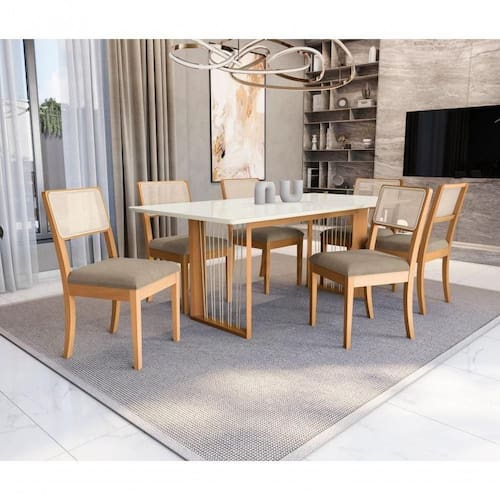 E para completar o design e conforto, o encosto possui telinha na cor bege, que além de um diferencial único, proporciona um acabamento ideal para uma sua sala de jantar mais completa. Renove e transforme sua Sala de Jantar com o Conjunto Kappesberg.