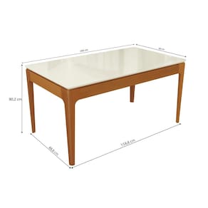 Medindo 77,2cm de altura, 158,8cm de largura e 88,8cm de profundidade, ela possui uma travessa central para mais estabilidade. E quando combinada ao tampo retangular com vidro, acomoda até seis pessoas. Em MDF de 30mm e na cor off white, o destaque fica para o vidro na mesma cor, garantindo um acabamento moderno à composição.