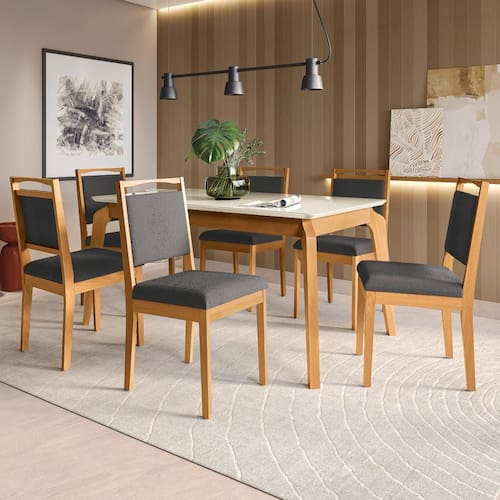 E com medidas de 77cm de altura, 168,8cm de largura e 98,7cm de profundidade, ela possui uma travessa central, e quando combinada ao tampo retangular com vidro, acomoda até seis pessoas. Em MDF de 30mm, pintado na cor off white, o destaque é o vidro na mesma cor, garantindo um acabamento único e moderno à composição. E medindo 160cm de largura e 90cm de profundidade, garante ainda mais beleza e estilo para seu espaço. Já as cadeiras que compõem o conjunto, seis unidades do modelo Lina, também em madeira de eucalipto, são entregues montadas, e suportando até 120kg, combinam com todos os momentos.