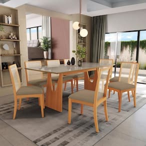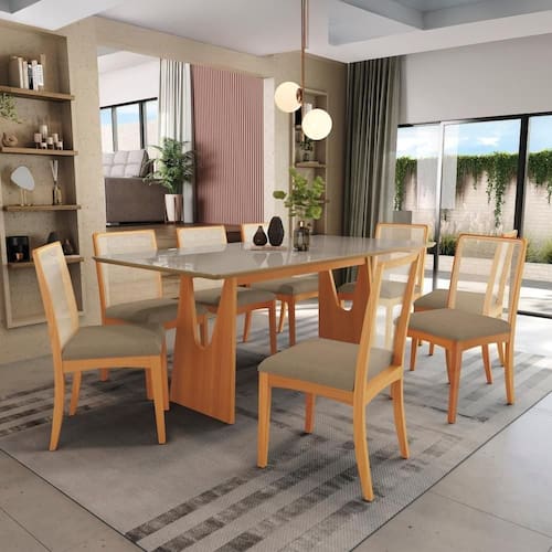 Com 92,5cm de altura, sendo 50cm a altura do assento, 44,5cm de largura e 55,5cm de profundidade, para mais comodidade, as cadeiras contam com assento estofado recoberto com tecido boucle fendi, o que garante um toque suave e gostoso. E para completar seu design e garantir ainda mais conforto, o encosto possui telinha na cor bege, proporcionando um acabamento perfeito para todos os momentos, deixando sua sala de jantar mais completa. Renove seu espaço com o Conjunto de Sala de Jantar da Kappesberg.