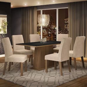 Itens inclusos: - Uma (1) mesa com base pedestal e tampo em MDP - Seis (6) cadeiras com encosto e assento estofados