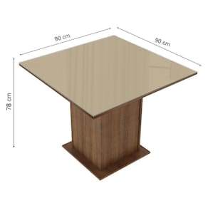 A mesa conta com base em pedestal e possui tampo com topo em pintura Crema e vidro incolor sobreposto.