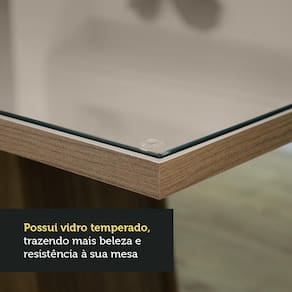 A mesa conta com base em pedestal e possui tampo com topo em pintura Crema e vidro incolor sobreposto.