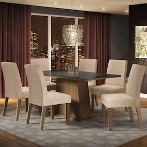 Itens inclusos: - Uma (1) mesa de 79 cm de altura com base pedestal e tampo de MDP e vidro incolor sobreposto com 160 cm de largura x 90 cm de comprimento - Seis (6) cadeiras de 94 cm de altura com encosto e assento estofados