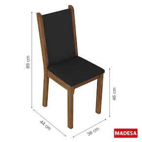 As cadeiras em madeira possuem assento estofado com tecido que combina com o encosto e do tampo da mesa. Um diferencial que agrega beleza ao conjunto.