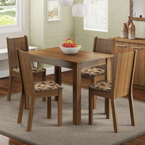 - Quatro (4) cadeiras de 89 cm de altura com encosto em madeira no padrão amadeirado Rustic e assento em tecido floral bege marrom