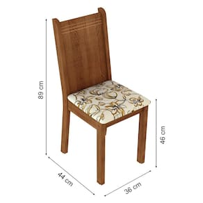 - Quatro (4) cadeiras de 89 cm de altura com encosto em madeira no padrão amadeirado rustic e assento em tecido floral lírio bege.