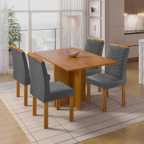 As cadeiras suportam bastante peso? Sim, possuem estrutura firme e estável para garantir segurança. Medida da Mesa (A x L x P): 79cmx100cmx80cm Peso da Mesa: 20 kg Mesa suporta até: 40 kg Acabamento da Cadeira/Banco: Pintura Acabamento da Mesa: Pintura UV Acompanha Manual de Instalação: Sim Almofada do assento: Fixa Ambiente Principal: Sala de Jantar Cadeira/Banco Estofada: Encosto e Assento Estofados Cadeira/Banco estofada: Encosto e Assento Estofados Cadeira/Banco Suporta Até: 120.0000 Cadeira/Banco suporta até: 120 kg codigo_ean: 7900288228437 Complexidade da Montagem: Média: pode ser montado por mais de uma pessoa e/ou necessite de maior conhecimento para montagem Cor: Cinamomo/Cinza Cor do Produto: Cinamomo/Cinza Cor Secundária: Cinza De Canto (Canto Alemão): Não Enchimento do Assento: Espuma D-23 Enchimento do Encosto: Espuma D-20 Escala de Brilho: Fosco Espessura do Tampo: 18 mm Estrutura do Assento: MDF Formato do Tampo: Retangular Itens Inclusos: 1 Mesa, 4 Cadeiras, Kit Ferragens e Manual de Montagem Linha ou Coleção: Dakota /Carol Manual de Montagem e Instalação: https://product-hub-prd.madeiramadeira.com.br/994737046/documents/bef2f571-7b65-47fe-99d7-ec1c3bff22dc313658273217551982118826.pdf Marca: Cel Móveis Material da Base da Mesa: MDF Material da Estrutura da Cadeira: MDF/MDP Material do Tampo: MDF Material Principal: MDF Material Principal das Cadeiras/Bancos: MDF/MDP Medida da Cadeira/Banco (A x L x P): 98,5cmx44cmx56cm Medida do Tampo (L x C x E): 100cmx80cmx18mm Mesa Dobrável: Não Mesa Extensível: Não Necessita Montagem: Sim Origem do Produto: Nacional Peso da Cadeira/Banco: 9,1 kg Possui Apoio para Braços: Não Possui Apoio Para os Pés: Não Possui Vidro: Não Quantidade de Cadeiras: 4 Quantidade de Lugares: 04 Recomendações de Uso, Manutenção e Limpeza: Limpar com pano macio e levemente umedecido. Não utilizar solventes a base e de inflamáveis. Não utilizar produtos abrasivos. Revestimento da Cadeira/Banco: Veludo Sistema de Montagem: Parafusos. Tipo de Assento: Fixo Tipo de Encosto: Fixo