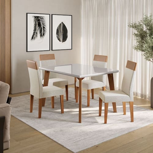 Perfeitas para compor salas de jantar, cozinhas ou espacos gourmet, combinando design classico e acabamento refinado. Mesa de Jantar Madetal Dubai 4 Lugares com tampo MDP com Vidro colado.