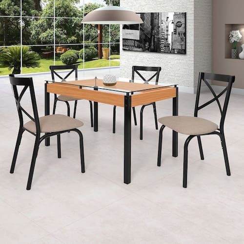 O conjunto de mesa Karina, é o conjunto ideal para sua cozinha, na cor preto fosco e com tampo de vidro de 1,2M X 0,75M, possui 4 cadeiras com desing moderno e anatômico, estofado em tecido linho ideal para seu ambiente. Medida da Mesa (A x L x P): 77cmx120cmx75cm Peso da Mesa: 28,71 kg Mesa suporta até: 10 kg Acabamento da Cadeira/Banco: Pintura Epóxi Acabamento da Mesa: Pintura Epóxi Almofada do assento: Removível Ambiente Principal: Cozinha Cadeira/Banco estofada: Sim Cadeira/Banco suporta até: 100 kg codigo_ean: 7900288209771 Complexidade da Montagem: Baixa: pode ser montado por uma pessoa sozinha Cor: Preto Fosco / Bege Cor do Produto: Preto Fosco / Bege Enchimento do Assento: Espuma D-20 Escala de Brilho: Fosco Espessura do Tampo: 8 mm Itens Inclusos: 1 Mesa, 4 Cadeiras, Kit Ferragens e Manual de Montagem Linha ou Coleção: Karina Manual de Montagem e Instalação: https://product-hub-prd.madeiramadeira.com.br/307748436/documents/302d2dbb-91de-4582-9890-b33b918dda3db4ae0b8a43e3f8a71754509812.pdf Marca: Ciplafe Material da Base da Mesa: Madeira e ferro Material da Estrutura da Cadeira: Aço Carbono Material do Tampo: Vidro Medida da Cadeira/Banco (A x L x P): 90cmx50cmx53cm Medida do Tampo (L x C x E): 75cmx120cmx0,8cm Necessita Montagem: Sim Origem do Produto: Nacional Peso da Cadeira/Banco: 4,25 kg Possui Apoio Para os Pés: Não Quantidade de Cadeiras: 4 Quantidade de Lugares: 04 Recomendações de Uso, Manutenção e Limpeza: Limpar com pano levemente umedecido. Não usar produtos abrasivos que possam danificar a superfície do móvel. Revestimento da Cadeira/Banco: Courino Sistema de Montagem: Parafusos Vidro Temperado: Não