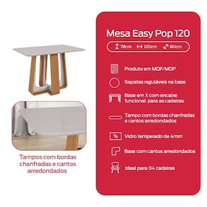 Produzida em MDP/MDF com tampo maciço em MDF de 25mm, a mesa conta com vidro temperado de 4mm e acabamento superior: bordas chanfradas e arredondadas com toque aveludado, detalhe Off-White com pintura alto brilho e sapatas deslizadoras que protegem o piso.
