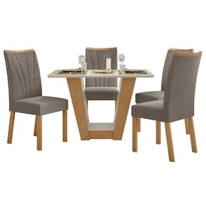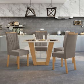 Reunir a família em sua sala de jantar com todo o conforto é tudo de bom, né? O Conjunto de Mesa Apogeu com Cadeiras Apogeu vai assegurar que as refeições sejam aconchegantes e deliciosas. A mesa retangular conta com uma base com um design diferenciado garantindo a sustentação do tampo com vidro temperado. Ah, já as 4 cadeiras são estofadas e vão acomodar muito bem os seus convidados. Curtiu? Medida da Mesa (A x L x P): 77,2x120x80cm Peso da Mesa: 37,23 kg Mesa suporta até: 40.0000 Acabamento da Cadeira/Banco: Pintura UV Acabamento da Mesa: Pintura UV Almofada do assento: Fixa Ambiente Principal: Sala de Jantar Cadeira/Banco estofada: Sim Cadeira/Banco suporta até: 120.0000 codigo_ean: 7909903231265 Complexidade da Montagem: Alta: deve ser montado por um montador especializado Cor: Amêndoa Clean/Off White/Animale Bege Cor do Produto: Amêndoa Clean/Off White/Animale Bege De Canto (Canto Alemão): Não Design da Base: Em U Enchimento do Assento: Espuma D-23 Enchimento do Encosto: Espuma D-23 Escala de Brilho: Fosco Espessura do Tampo: 22 mm Estrutura do Assento: MDF/MDP Estrutura do Encosto: MDF/MDP Formato do Tampo: Retangular Itens Inclusos: 1 Mesa 6 Cadeiras e Manual de Montagem Manual de Montagem e Instalação: https://product-hub-prd.madeiramadeira.com.br/822070/documents/ba21d42c-becd-4ea5-9cae-ef2bad91f6ffuntoapogeu120cadeiraapogeu.pdf Material da Base da Mesa: MDP Material da Estrutura da Cadeira: MDF Material do Tampo: Vidro/MDF Material Principal das Cadeiras/Bancos: MDF Medida da Base (A x L x P): 72x45x36,6cm Medida da Cadeira/Banco (A x L x P): 97cmx42cmx59cm Medida do Tampo (L x C x E): 80x120x2,2cm Mesa Extensível: Não Necessita Montagem: Sim Origem do Produto: Nacional Peso da Cadeira/Banco: 9 kg Possui Apoio para Braços: Não Possui Apoio Para os Pés: Não Possui Suporte Giratório: Não Quantidade de Cadeiras: 4 Quantidade de Lugares: 04 Recomendações de Uso, Manutenção e Limpeza: Limpar com flanela limpa e seca. Não usar produtos abrasivos. Revestimento da Cadeira/Banco: Suede Sistema de Montagem: Parafusos e Minifix Vidro Temperado: Sim Ean: 7909903231265