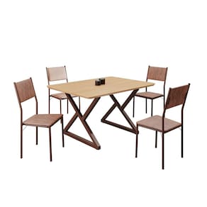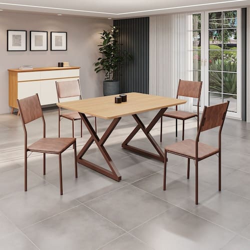 Este conjunto de mesa retangular e 4 cadeiras oferece estilo e praticidade. Com estrutura tubular em aço para estabilidade, o tampo em MDF cinamomo adiciona sofisticação e resistência a riscos e manchas. As cadeiras combinam harmoniosamente com a mesa, garantindo conforto com estofamento. Ideal para diversos espaços, é perfeito para receber convidados ou desfrutar de refeições em família, criando um ambiente acolhedor e elegante. Medida da Mesa (A x L x P): 77cm x 120cm x 90cm Peso da Mesa: 23,36 kg Mesa suporta até: 10.0000 Acabamento da Cadeira/Banco: Pintura Texturizada Acabamento da Mesa: Melamínico Almofada do assento: Fixa Ambiente Principal: Sala de Jantar Cadeira/Banco Estofada: Encosto e Assento Estofados Cadeira/Banco estofada: Encosto e Assento Estofados Cadeira/Banco suporta até: 120.0000 codigo_ean: 7909903963029 Complexidade da Montagem: Baixa: pode ser montado por uma pessoa sozinha Cor: Marrom Cor do Produto: Marrom De Canto (Canto Alemão): Não Enchimento do Assento: Espuma D-12 Escala de Brilho: Semi-Fosco Espessura do Tampo: 20 mm Formato do Tampo: Retangular Itens Inclusos: 1 Mesa, 4 Cadeira, Manual De Montagem E Ferragens. Linha ou Coleção: Florença Manual de Montagem e Instalação: https://product-hub-prd.madeiramadeira.com.br/953761/documents/9eb84402-cee0-4a49-a0d3-8ecb6fab7f9e2158475524617216504680458.pdf Material da Base da Mesa: Aço Material da Estrutura da Cadeira: Aço Material do Tampo: MDF Medida da Cadeira/Banco (A x L x P): 90,5cm x 44,5cm x 49cm Medida do Tampo (L x C x E): 90cm x 120cm x 2cm Mesa Extensível: Não Necessita Montagem: Sim Origem do Produto: Nacional Peso da Cadeira/Banco: 4,74 kg Possui Apoio Para os Pés: Não Quantidade de Lugares: 04 Recomendações de Uso, Manutenção e Limpeza: Usar um pano de tecido macio e seco, evitar detergentes, alvejantes e produtos químicos de limpeza; no tampo usar tecido macio levemente umedecido. Revestimento da Cadeira/Banco: Couro Ecológico Sistema de Montagem: Parafusos