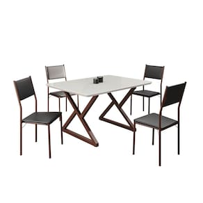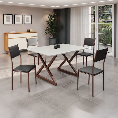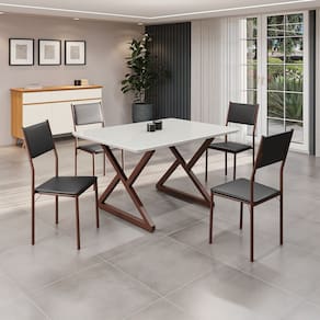 Este conjunto de mesa retangular e 4 cadeiras oferece estilo e praticidade. Com estrutura tubular em aço para estabilidade, o tampo em Mdf Laca off white com vidro adiciona sofisticação e resistência a riscos e manchas. As cadeiras combinam harmoniosamente com a mesa, garantindo conforto com estofamento. Ideal para diversos espaços, é perfeito para receber convidados ou desfrutar de refeições em família, criando um ambiente acolhedor e elegante. Medida da Mesa (A x L x P): 77,5cm x 120cm x 90cm Peso da Mesa: 39,6 kg Mesa suporta até: 10.0000 Acabamento da Cadeira/Banco: Pintura Texturizada Almofada do assento: Fixa Ambiente Principal: Sala de Jantar Cadeira/Banco estofada: Encosto e Assento Estofados Cadeira/Banco Estofada: Encosto e Assento Estofados Cadeira/Banco suporta até: 120.0000 codigo_ean: 7909903963159 Complexidade da Montagem: Baixa: pode ser montado por uma pessoa sozinha Cor: Preto/ Marrom Cor do Produto: Preto/ Marrom De Canto (Canto Alemão): Não Enchimento do Assento: Espuma D-12 Escala de Brilho: Semi-Fosco Espessura do Tampo: 25 mm Formato do Tampo: Retangular Itens Inclusos: 1 Mesa, 4 Cadeira, Manual De Montagem E Ferragens. Linha ou Coleção: Florença Manual de Montagem e Instalação: https://product-hub-prd.madeiramadeira.com.br/955290/documents/46ecd8d7-bd7e-46d8-a0db-4021964730f52158475524617216504680458.pdf Material da Base da Mesa: Aço Material da Estrutura da Cadeira: Aço Material do Tampo: MDF/Vidro Medida da Cadeira/Banco (A x L x P): 90,5cm x 44,5cm x 49cm Medida do Tampo (L x C x E): 90cm x 120cm x 2,5cm Mesa Extensível: Não Necessita Montagem: Sim Origem do Produto: Nacional Peso da Cadeira/Banco: 4,74 kg Possui Apoio Para os Pés: Não Quantidade de Lugares: 04 Recomendações de Uso, Manutenção e Limpeza: Usar um pano de tecido macio e seco, evitar detergentes, alvejantes e produtos químicos de limpeza; no tampo usar tecido macio levemente umedecido. Revestimento da Cadeira/Banco: Couro Ecológico Sistema de Montagem: Parafusos