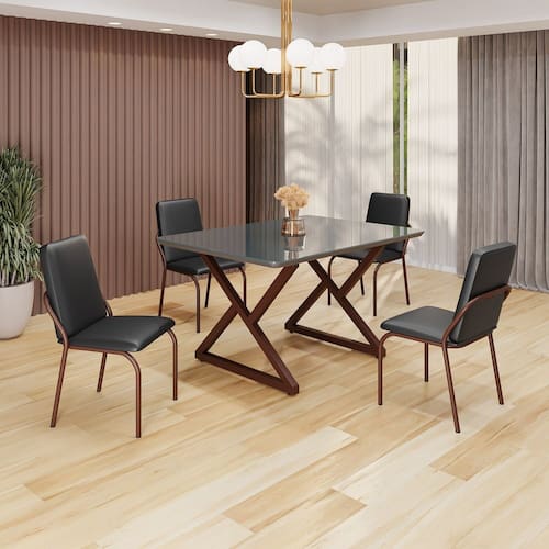 Este conjunto de mesa retangular e 4 cadeiras oferece estilo e praticidade. Com estrutura tubular em aço para estabilidade, o tampo em MDF Laca grafite com vidro adiciona sofisticação e resistência a riscos e manchas. As cadeiras combinam harmoniosamente com a mesa, garantindo conforto com estofamento. Ideal para diversos espaços, é perfeito para receber convidados ou desfrutar de refeições em família, criando um ambiente acolhedor e elegante.
