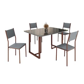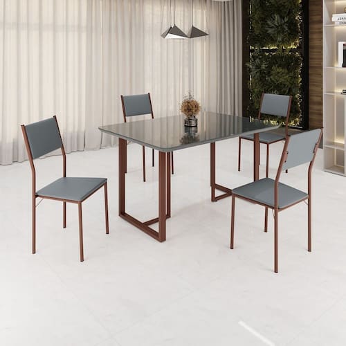 Este conjunto de mesa retangular e 4 cadeiras oferece estilo e praticidade. Com estrutura tubular em aço para estabilidade, o tampo em Mdf Laca grafite com vidro adiciona sofisticação e resistência a riscos e manchas. As cadeiras combinam harmoniosamente com a mesa, garantindo conforto com estofamento. Ideal para diversos espaços, é perfeito para receber convidados ou desfrutar de refeições em família, criando um ambiente acolhedor e elegante.