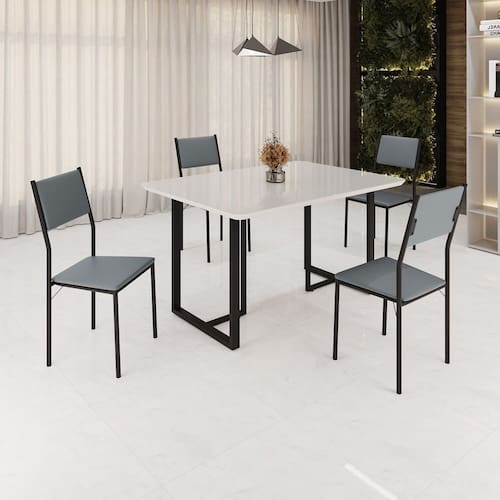 Este conjunto de mesa retangular e 4 cadeiras oferece estilo e praticidade. Com estrutura tubular em aço para estabilidade, o tampo em MDF Laca off white com vidro adiciona sofisticação e resistência a riscos e manchas. As cadeiras combinam harmoniosamente com a mesa, garantindo conforto com estofamento. Ideal para diversos espaços, é perfeito para receber convidados ou desfrutar de refeições em família, criando um ambiente acolhedor e elegante.